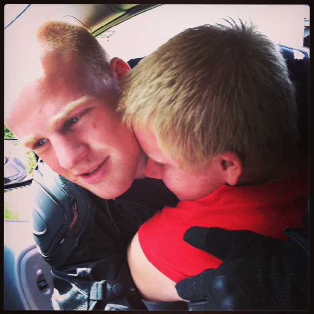 Cedric was leaving for camp and his brother leaned in the car to give him a hug.