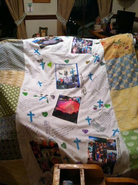 She and her daughter have made a quilt, filled with pictures and scriptures from this blog. There are pillows. One for each of the kids.